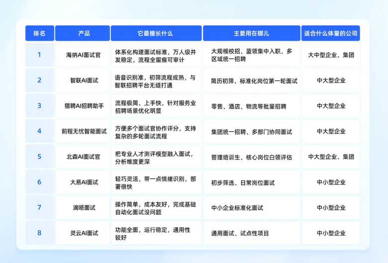 我们深入调研了2025年市场上声量最高、落地案例扎实的八款AI面试产品,希望为你呈现一份清晰的产品定位与差异盘点。